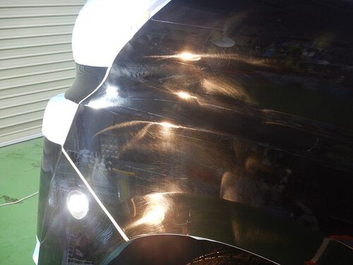 お客様より相談を受け、屋外でもハッキリとわかる外装の痛み。 202ブラックという事もあり年数も考えると当然と思えますが違和感がありました。 実際に入庫して確信へと。それがトップ画像です。 全体がミガキ傷だらけです。 陥没クレーターは仕方が無いとし…
